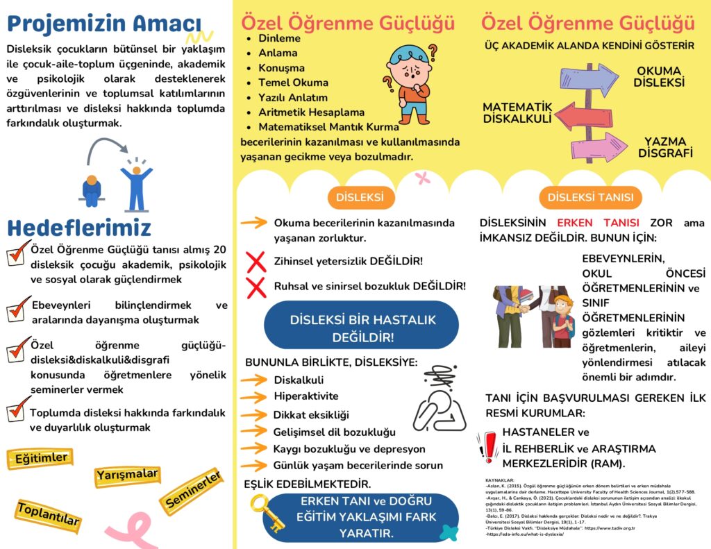 Afyonkarahisar Merkez ilçede ilköğretim düzeyindeki disleksik çocukların bütünsel bir yaklaşım ile çocuk-aile-toplum üçgeninde, akademik ve psikolojik olarak desteklenerek özgüvenlerinin ve toplumsal katılımlarının arttırılması ve disleksi hakkında toplumda farkındalık oluşturmak.